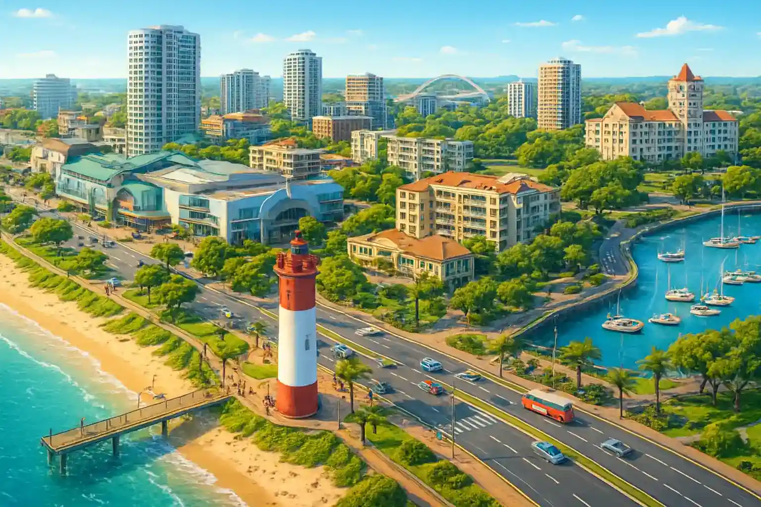 Flygplatsen ligger 20 km norrut via N2, en resa på 20–25 minuter beroende på trafik. Kan jag parkera vid Umhlanga Rocks strand? Ja, det finns betalparkeringar längs Lagoon Drive nära stranden.
