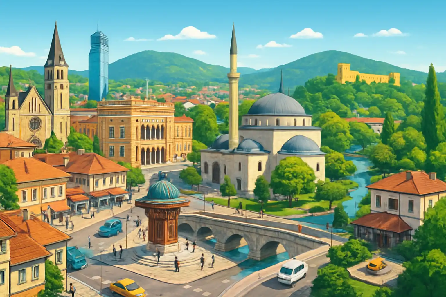 SJJ är beläget i Butmir-dalen nära Ilidža, omgivet av Sarajevos bergiga landskap. Gamla staden Baščaršija nås på 15 minuter och skidorterna Jahorina och Bjelašnica ligger 30–40 km bort. Med 30 uthyrare är priskonkurrensen god – jämför alltid priser online innan avresa.