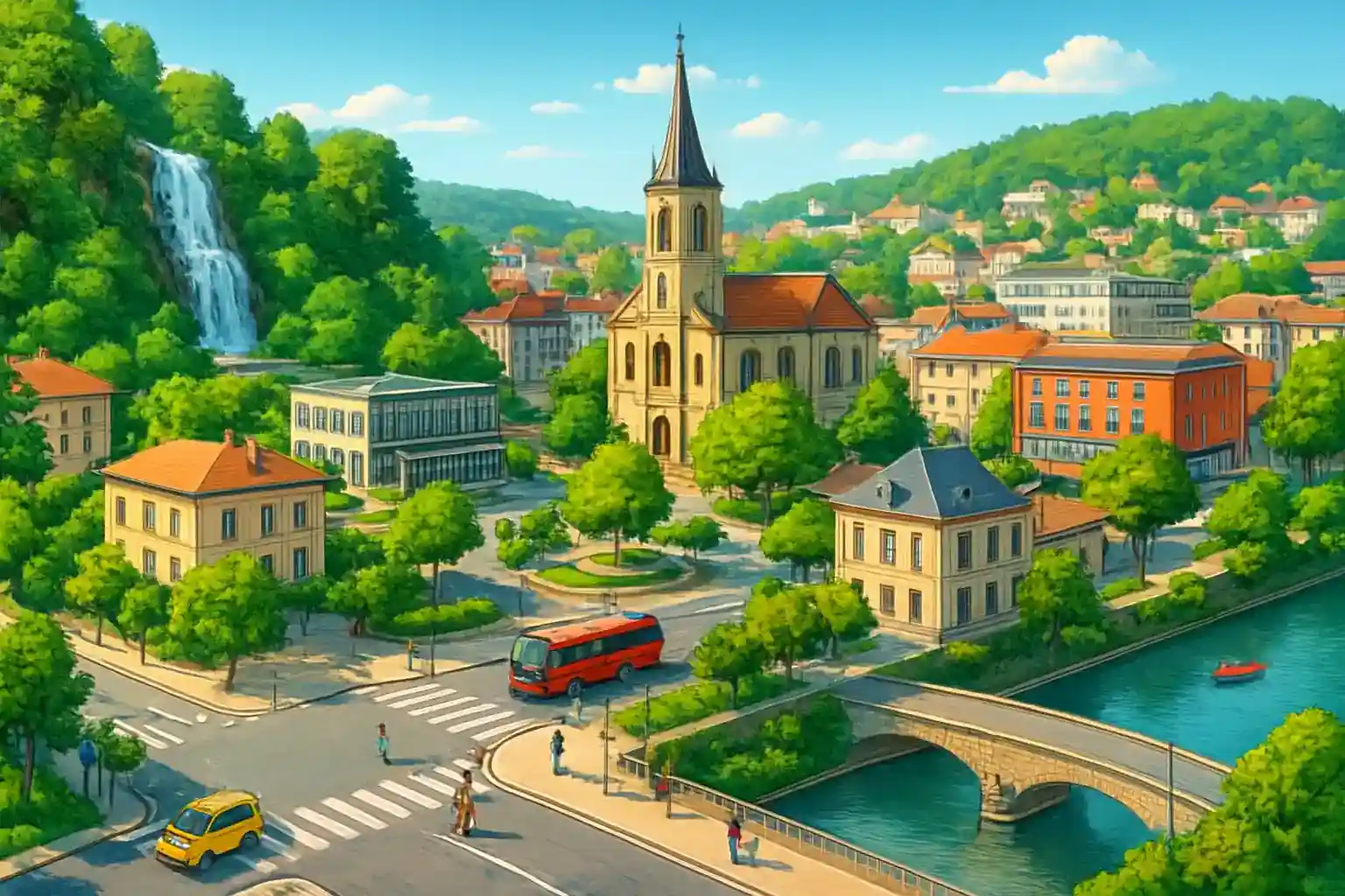 Oyonnax är känd som 'plasternas huvudstad' och har ett kompakt centrum med Place de l'Église som nav. Härifrån är det bara 25 km till Lac de Nantua och cirka 45 minuter till Bellegarde-sur-Valserine vid den schweiziska gränsen. Kör norrut på D18 mot Lac Genin – en av Frankrikes vackraste bergsjöar på bara 20 minuters körning.