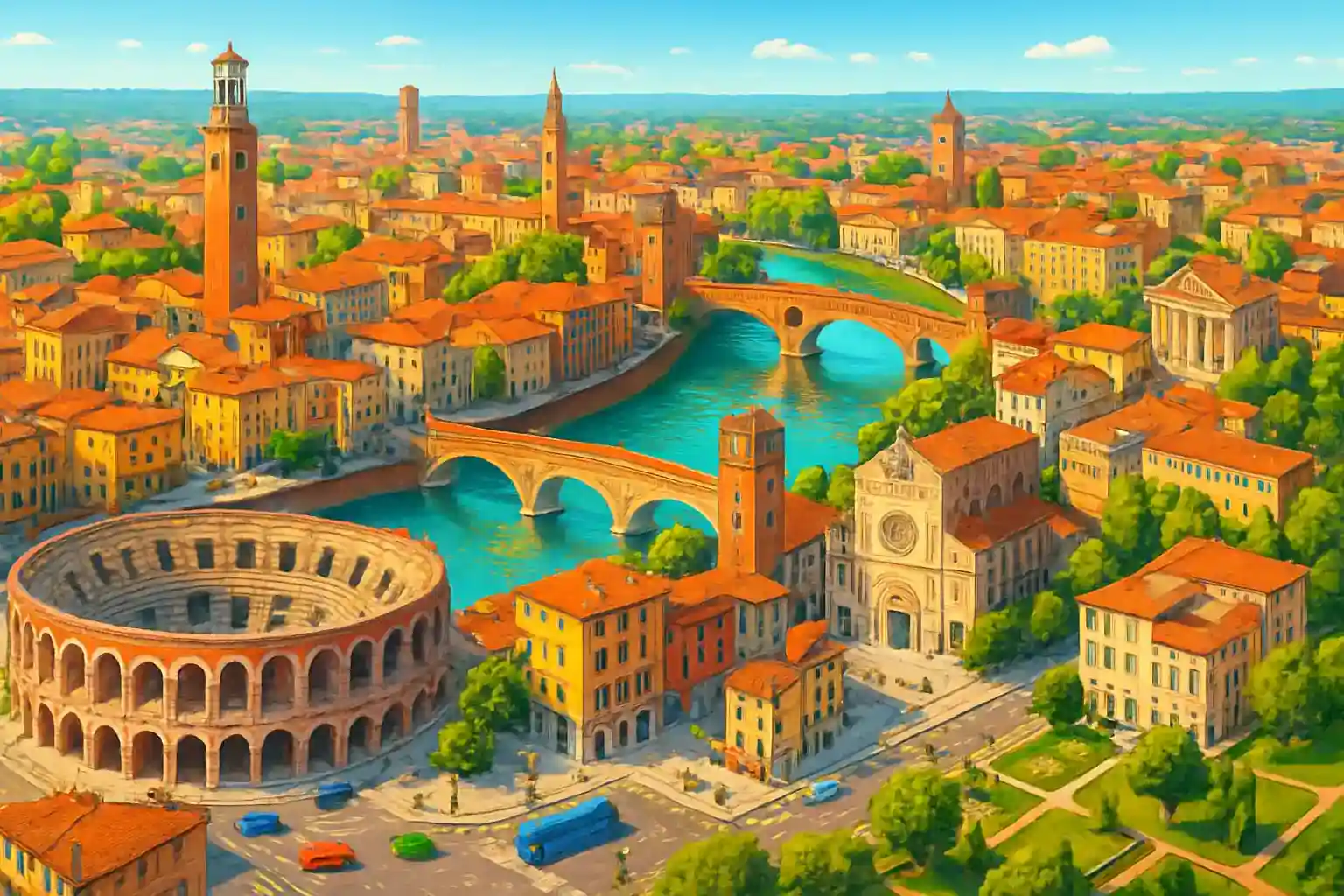 Verona är en UNESCO-listad stad med den välbevarade romerska arenan, Romeo och Julias balkongen och medeltida Castelvecchio. Från centrum är det 115 km till Venedig (1 tim 10 min), 155 km till Milano (1 tim 30 min) och 60 km till Trento (40 min) via A22. Parkera i ett av parkeringshusen utanför ZTL-zonen – Porta Nuova eller Fiera-parkeringen är bra alternativ, ca 10 minuters promenad från Arena.