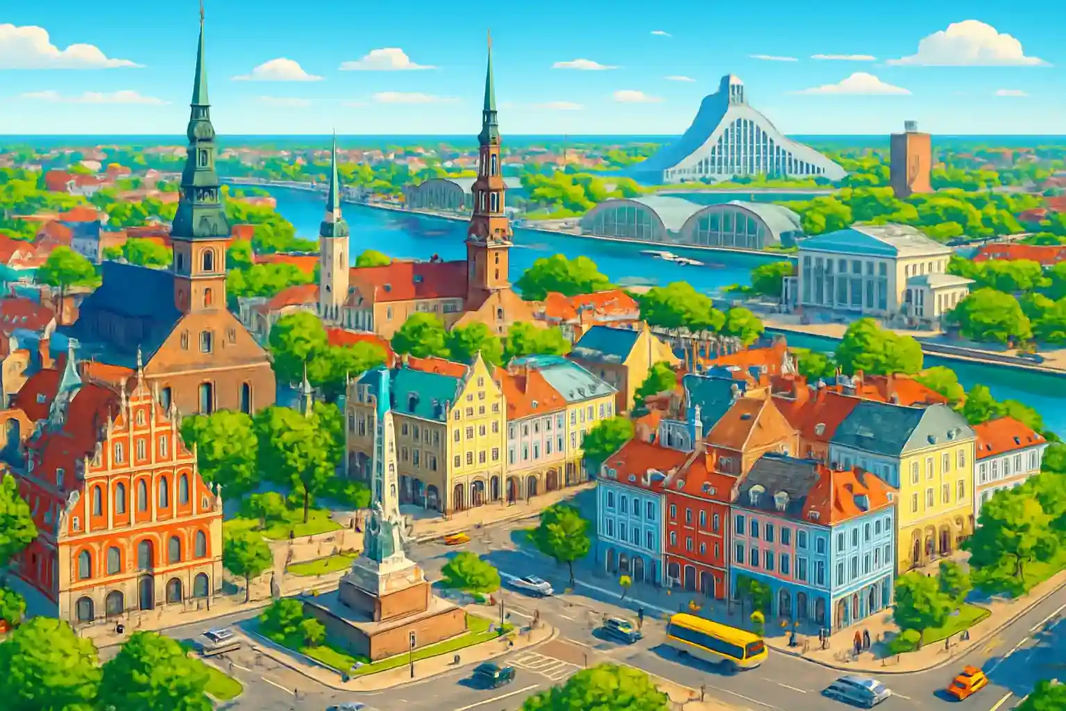 Rigas centrum erbjuder enkel tillgång till motorvägen E22 mot Tallinn (307 km norrut) och E67 söderut mot Vilnius (290 km). Parkeringen i centrum kan vara begränsad på vardagar, så planera för parkering i Kronvalda parks omgivningar eller vid Abrenes iela. Undvik att köra in i den historiska gamla stan – stora delar är bilfria och böter utfärdas.