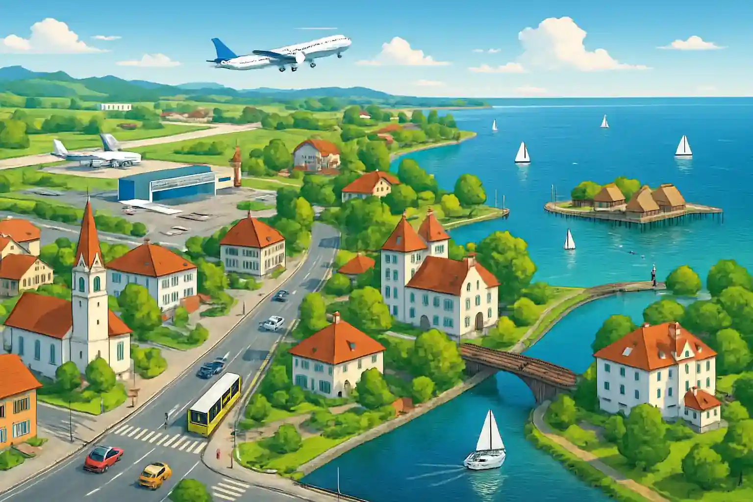 Gallen på 20 km (ca 20 min via A1), Bregenz i Österrike på 25 km (ca 25 min) och Konstanz i Tyskland på 35 km (ca 35 min). Bodensjön omges av tre länder och erbjuder fantastiska körvägar längs strandlinjen. Kontrollera att din hyrbilärsäkring täcker körning i Österrike och Tyskland – båda länderna nås inom 30 minuter.