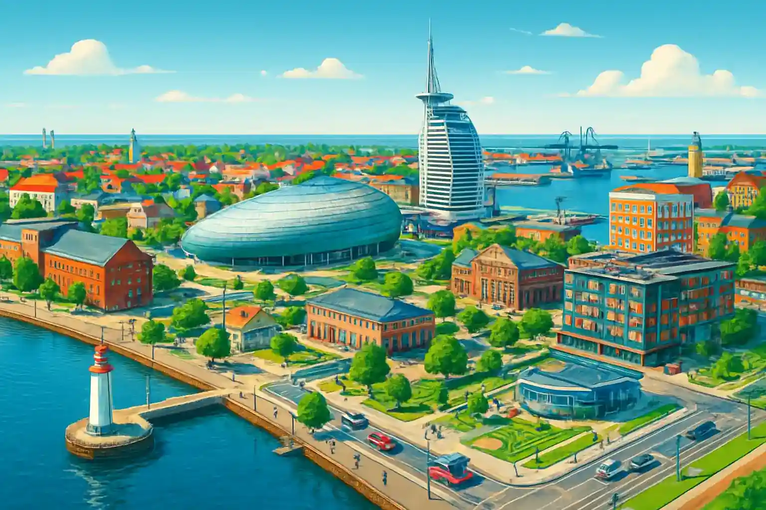 Bremerhaven centrum är hamnstadens puls, med det världsberömda Klimahaus och Deutsches Auswandererhaus bara ett stenkast från uthyrningsställena. Fyra uthyrare gör det enkelt att hitta rätt fordon för din resa längs den tyska Nordsjökusten. Härifrån når du Bremen på 65 km via A27, ca 45 minuter.