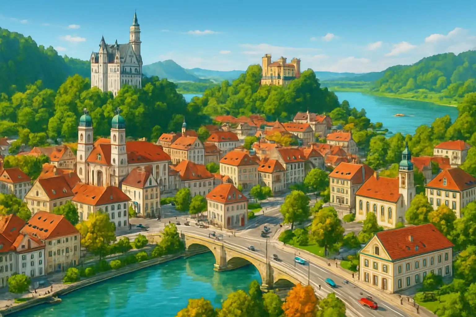 Österrikiska Reutte ligger bara 15 km söderut över gränsen. Boka hyrbil tidigt under sommarsäsongen – parkeringsplatser nära Neuschwanstein är begränsade och bil ger dig frihet att besöka slotten tidigt på morgonen. Kör Romantische Straße norrut mot Augsburg för en klassisk bayersk upplevelse.