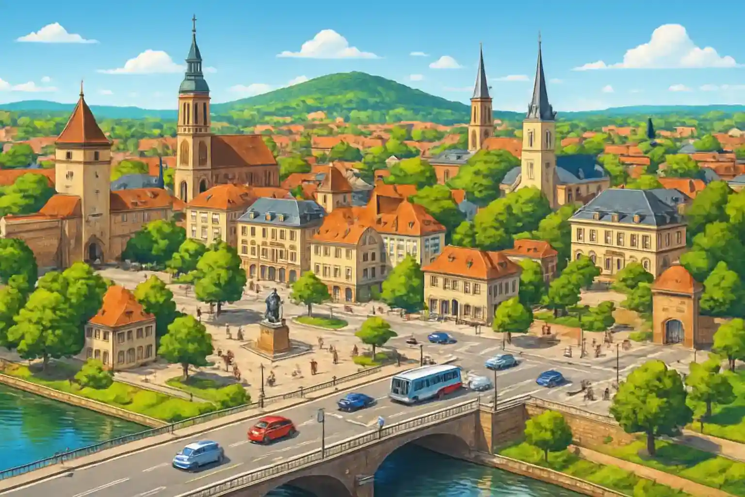 Ja, Landau har flera parkeringshus och öppna parkeringsplatser i centrum, bland annat vid Königstraße och Ostbahnhof. Kan jag köra till Alsace i Frankrike med hyrbilen? Wissembourg i Alsace ligger bara 25 km söderut.