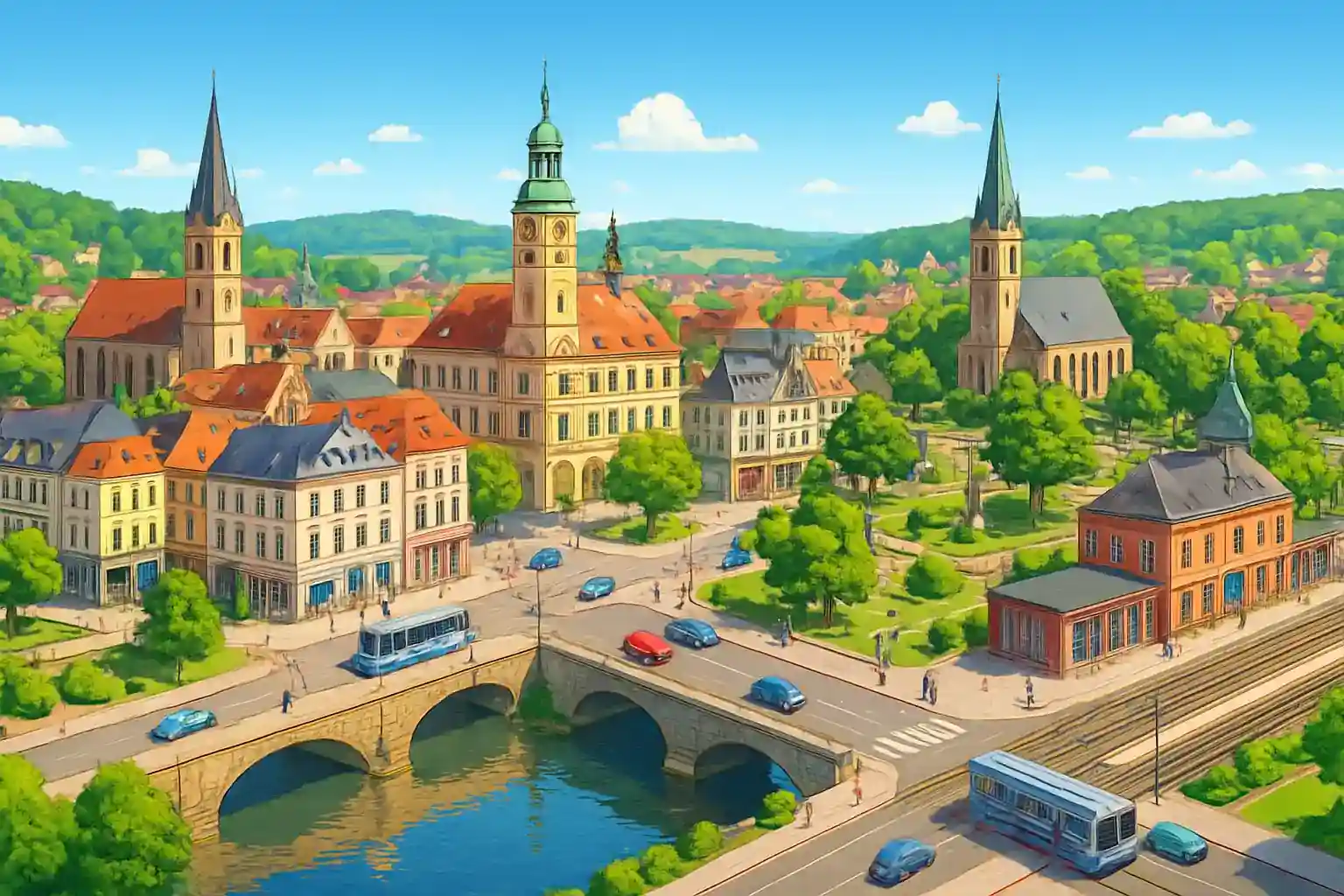 Freiberg med sin medeltida silvergruva och dom ligger ca 40 km sydväst. Hur långt är det från Waldheim till Dresden? Dresden ligger ca 70 km österut via A4, vilket tar ungefär 50–55 minuter med bil.