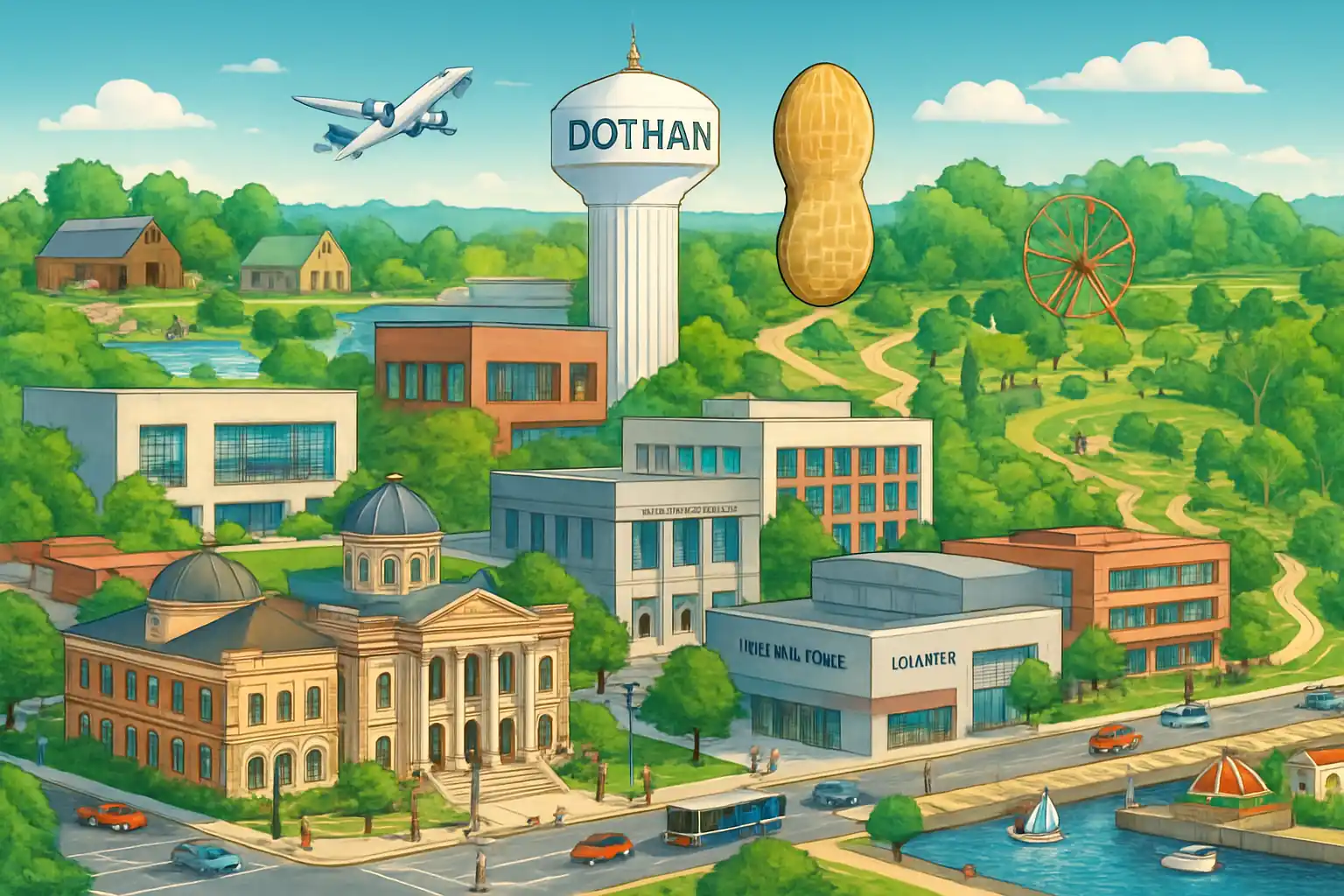 Dothan är Alabamas sjätte största stad och ett regionalt centrum för Wiregrass-området, känt för jordnötsproduktion och Landmark Park. Flygplatsen ligger strategiskt nära US-231 och ger snabb access till Dothan Civic Center, Westgate Park och Adventureland Theme Park. Med 3 uthyrare på DHN är utbudet begränsat – boka alltid i förväg, speciellt under National Peanut Festival i oktober.