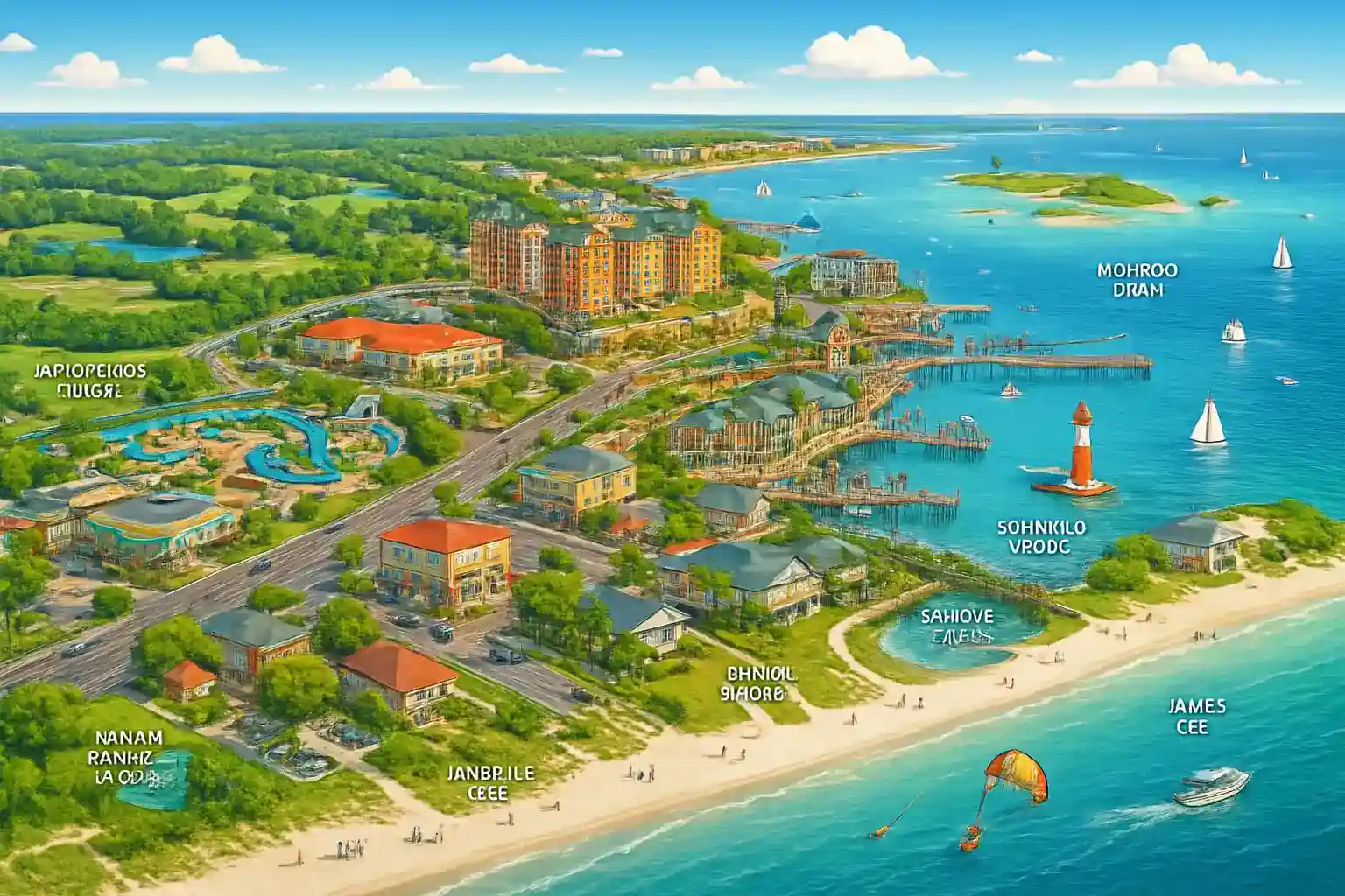 Destin Harbour Boardwalk med restauranger och båtturer ligger i hjärtat av staden. Henderson Beach State Park, ett av Floridas vackraste naturstränder, ligger 3 km österut. Fort Walton Beach nås på 15 minuter västerut via US-98, och Seaside i Walton County ligger 45 minuter österut.