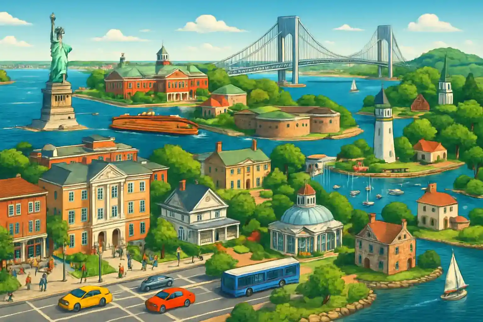 Undvik Goethals Bridge under fredagseftermiddagar då trafiken mot New Jersey kan stå stilla i timmar. Staten Island Expressway är snabbaste vägen till Manhattan – räkna 40–60 minuter. Välj en kompakt bil om du ska parkera i Manhattan.