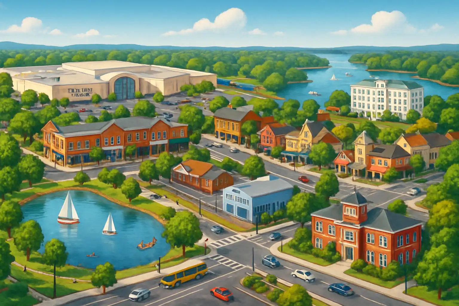 Pineville gränsar direkt till Charlotte och ligger strategiskt vid korsningen av Highway 51 och I-485, vilket gör det lätt att nå både Charlottes flygplats (ca 20 km norrut) och Lake Wylie i söder. Stadskärnan är kompakt med shopping och restauranger längs Main Street. Hyr bil tidigt på morgonen för att undvika rusningstrafiken på I-485.