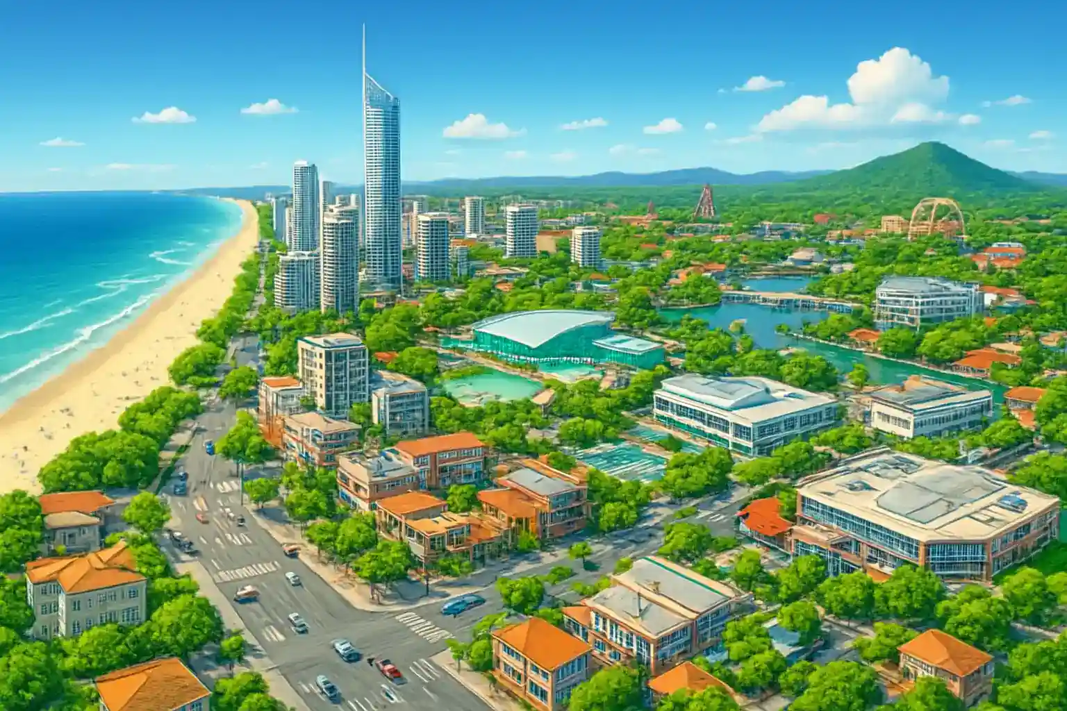 Hämta bilen direkt vid ankomstterminalen – alla 23 uthyrare har diskar inne i byggnaden. Kör norrut på Gold Coast Highway för den mest sceniska rutten längs kusten mot Surfers Paradise. Boka hyrbil med fri körsträcka om du planerar dagsutflykter till Brisbane eller Byron Bay.